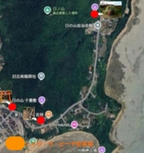 キワ・ラ・ビーチ駐車場から古尾稲荷神社鳥居 徒歩約4分